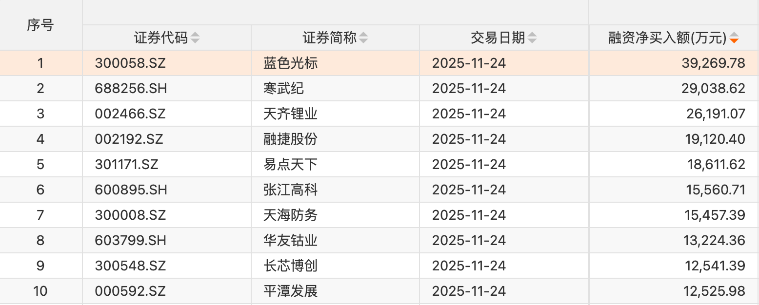 个股方面,17只个股获融资净买入额超1亿元。蓝色光标获融资净买入额居首,净买入3.93亿元;融资净买入金额居前的还有寒武纪、天齐锂业、融捷股份、易点天下、张江高科、天海防务等。